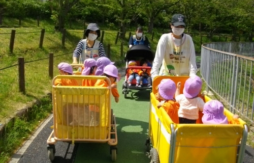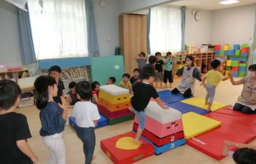 それぞれのクラスの発達にあわせて、さまざまな活動をしています。近くの公園へお散歩に出かけることが多く、野菜の栽培や収穫にも力を入れています。3・4・5歳の幼児さんたちは月に1回の「体操の先生とあそぼう会」で、跳び箱や鉄棒、マット運動などで体を動かしており、できることがどんどん増えていきます。